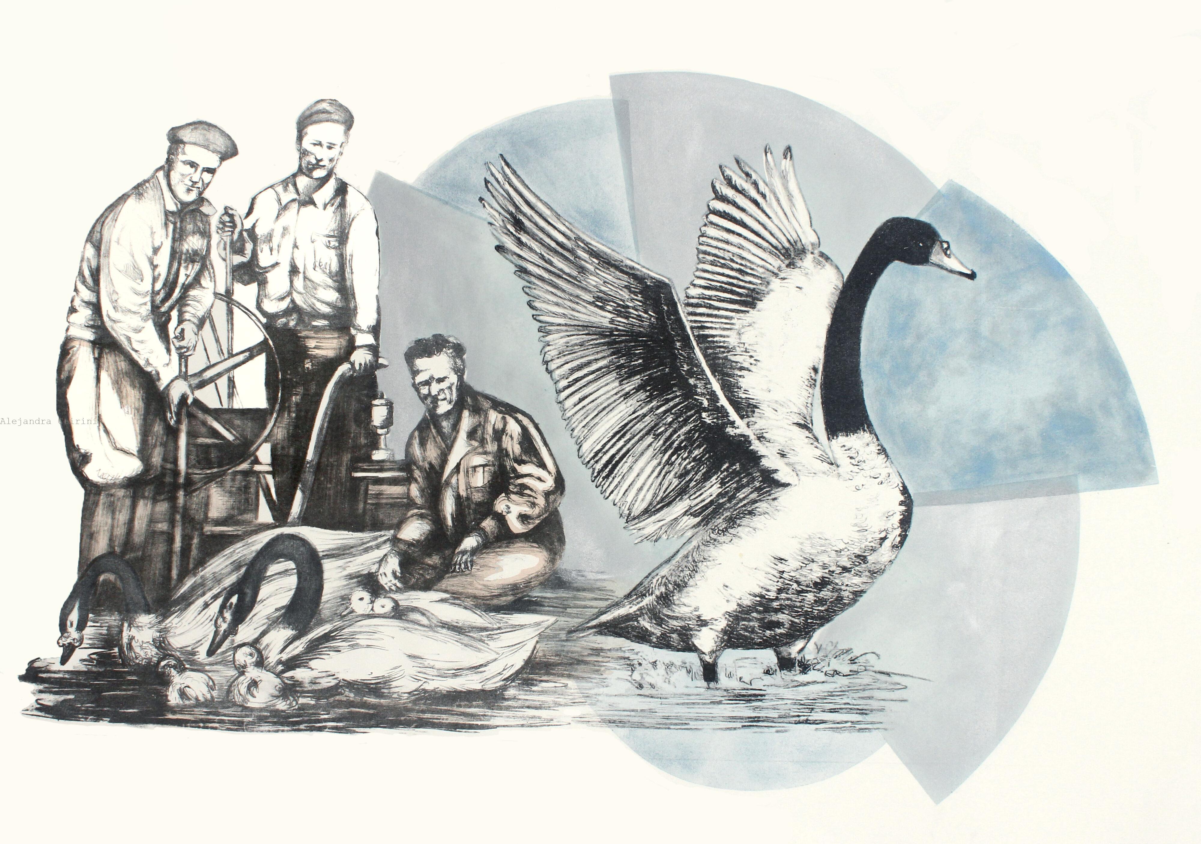 En mi serie Costureras trabajé tres imágenes en litografía, explorando el oficio y el gesto manual a través de la síntesis de la línea. Partí de fotografías que luego fui simplificando en distintas instancias, reduciendo las formas hasta quedarme con lo esencial del trazo. Me interesó detenerme en la repetición del movimiento, en la intimidad de la costura, en esas manos que unen y reparan, como si en cada puntada se tejiera también la memoria. El proceso de simplificación me permitió descubrir la fuerza expresiva de lo mínimo: la línea que sostiene la figura, el vacío que respira entre las formas y el ritmo que se crea al pasar de una imagen a otra. En este recorrido, la costura aparece no solo como un oficio, sino como metáfora de unión y continuidad, enlazando tiempos, cuerpos y recuerdos.