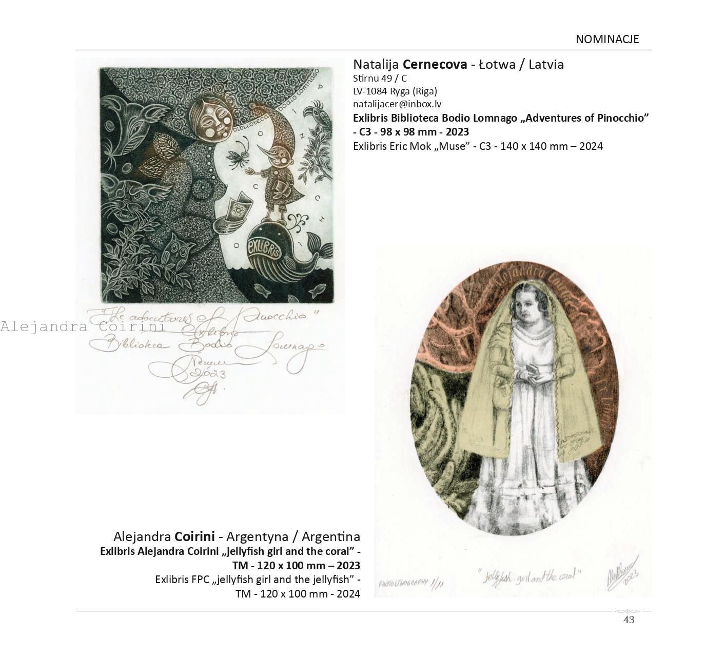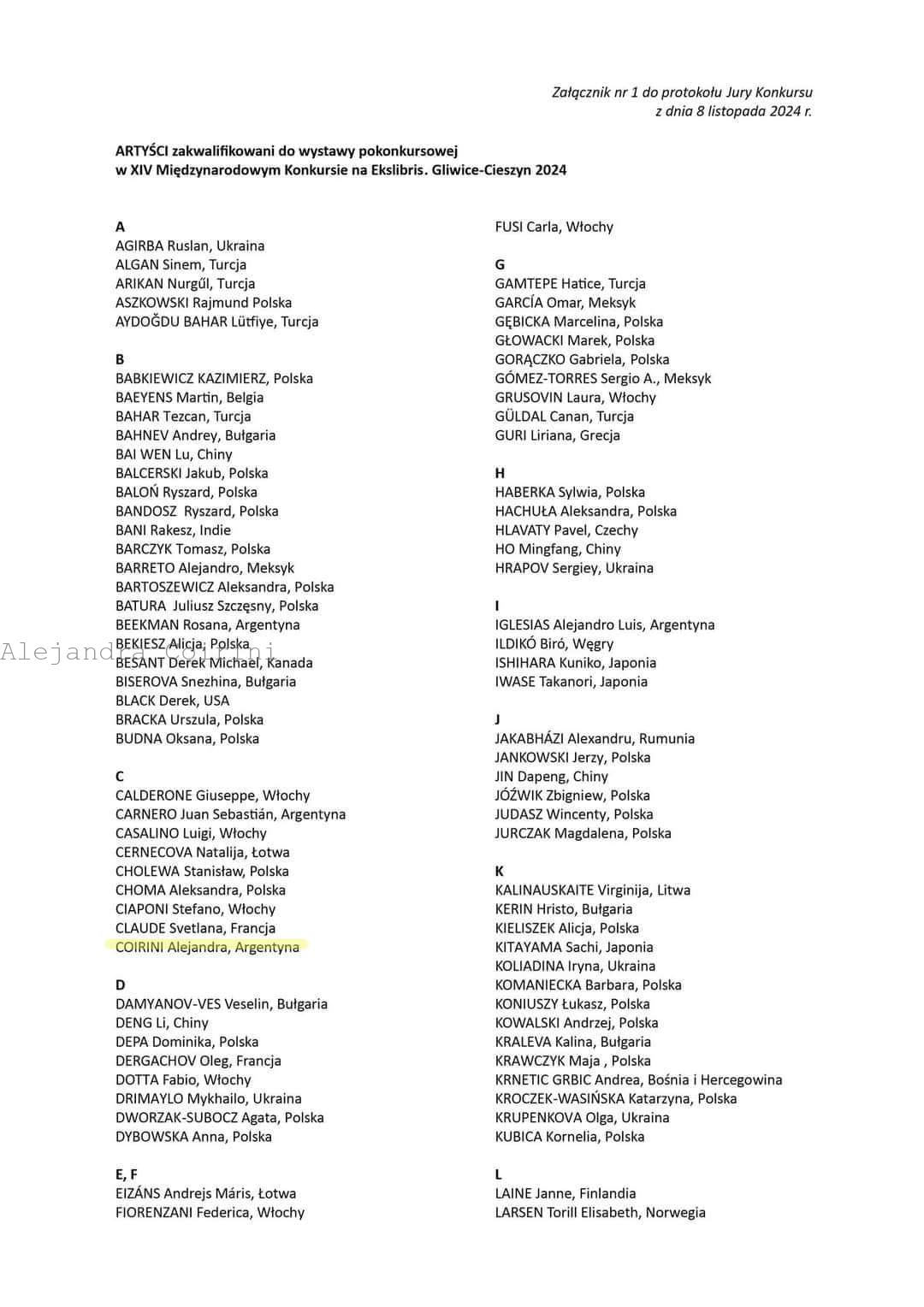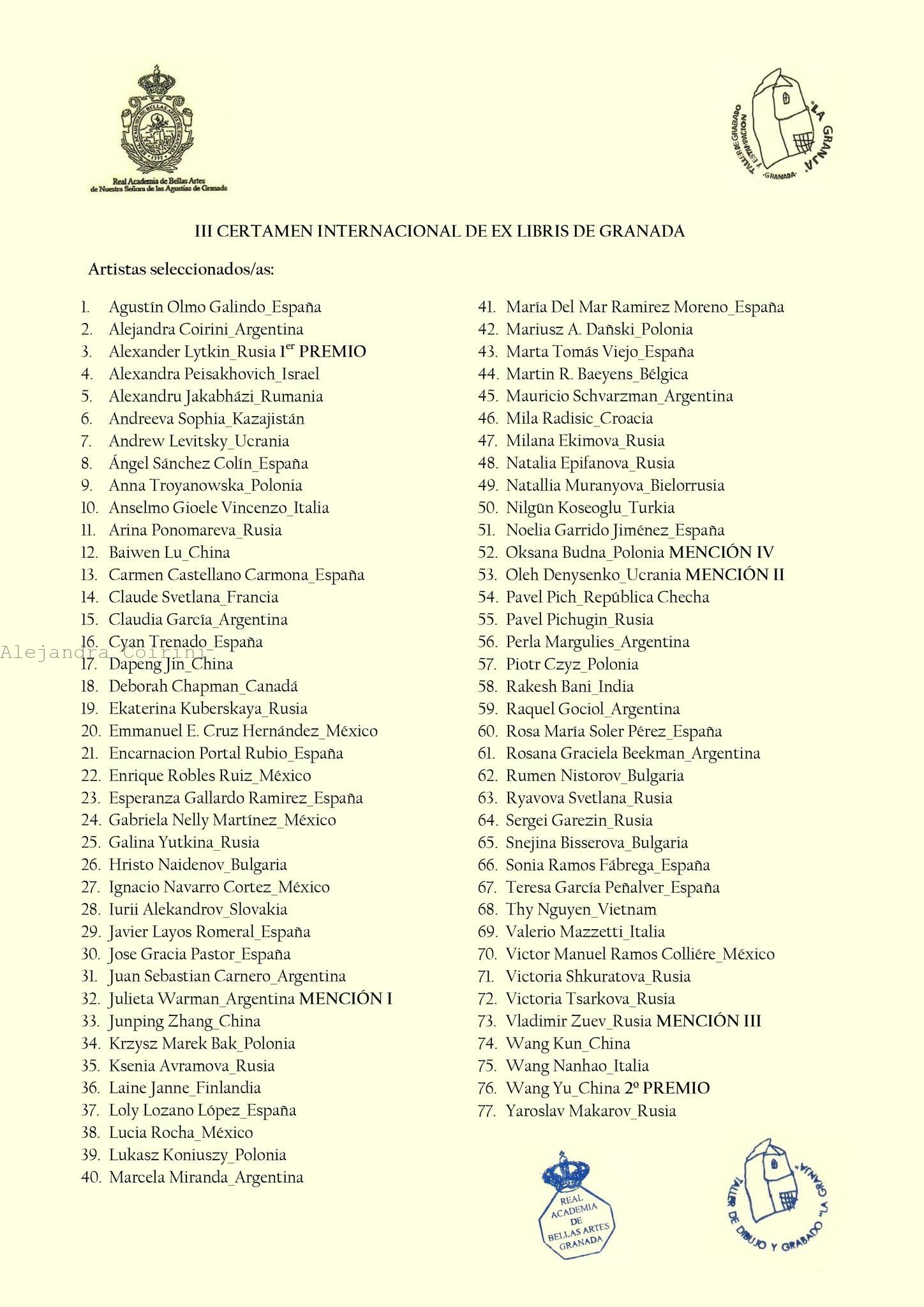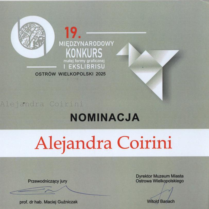 *Diciembre, enero 2025, Seleccionada en el XIV Concurso Gráfico Internacional sobre Ex libris. Gliwice – Cieszyn 2024,la exposición se realizó en la Biblioteca Pública Municipal de Gliwice, ul. Kościuszki 17, Gliwice, Polonia.