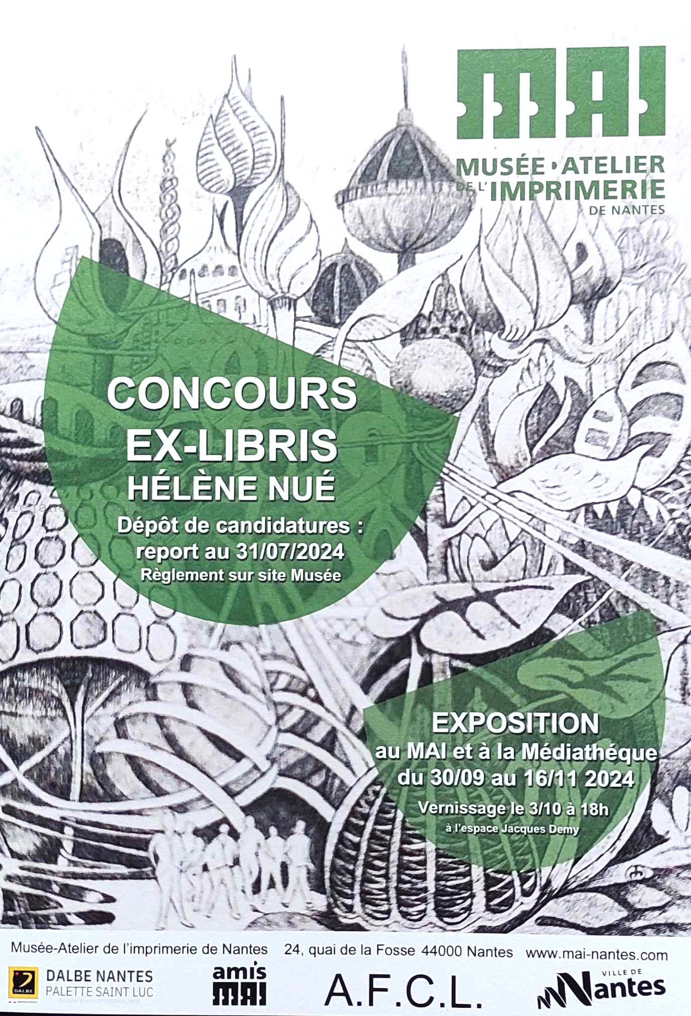 *Octubre, exposición de Ex Libris , Homenaje a Hélène Nué, organizado por el Musée-Atelier de l’imprimerie de Nantes – MAI. con la Biblioteca Municipal de Nantes presentado en la sala de exposiciones de la Mediateca Jacques-Demy 24 muelle de la Fosse / 44000 Nantes. Francia.