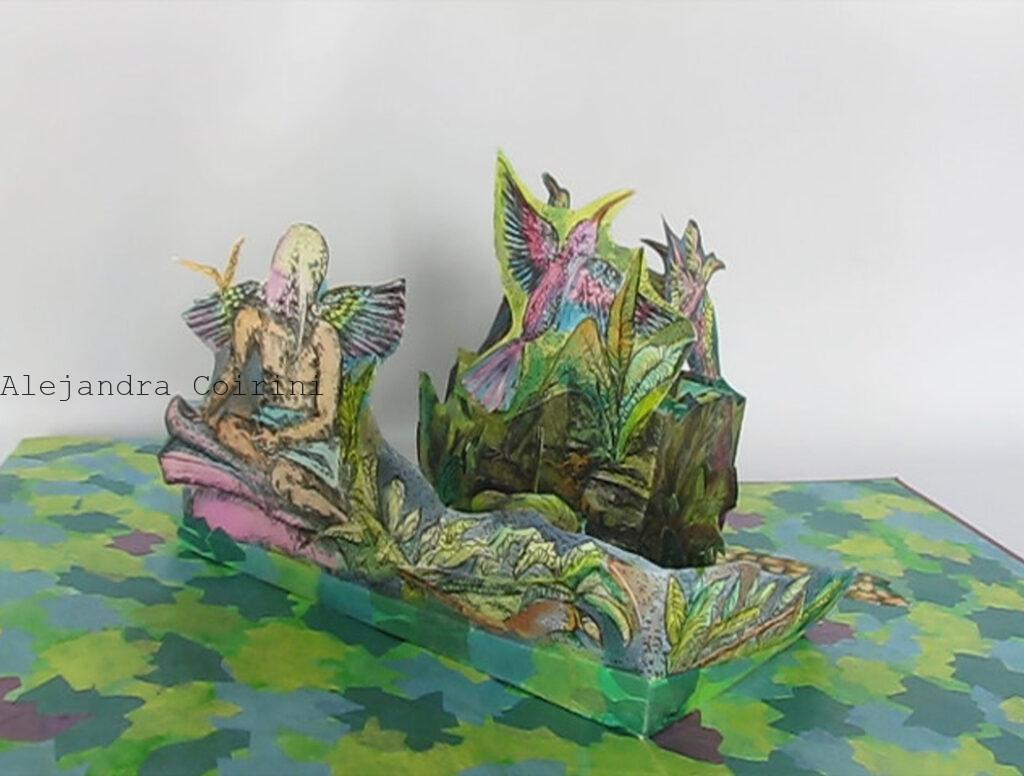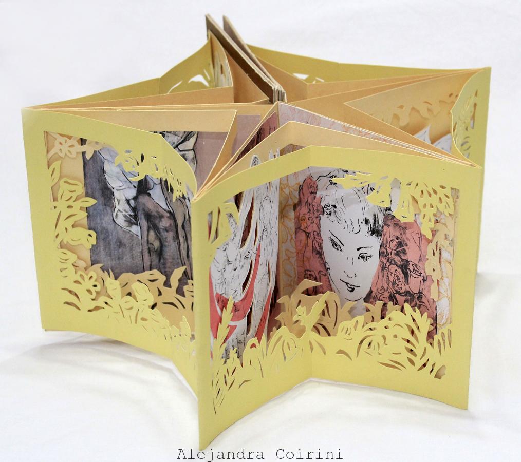 En este objeto, el libro deja de ser un simple contenedor de imágenes para convertirse en un espacio escenográfico, un escenario en miniatura donde las hadas que dibujo encuentran su hábitat. La estructura de carrusel permite que las escenas convivan entre sí, como ventanas que se abren a un mundo fantástico, mientras la luz y las sombras del papel recortado acentúan la sensación de magia y de juego.