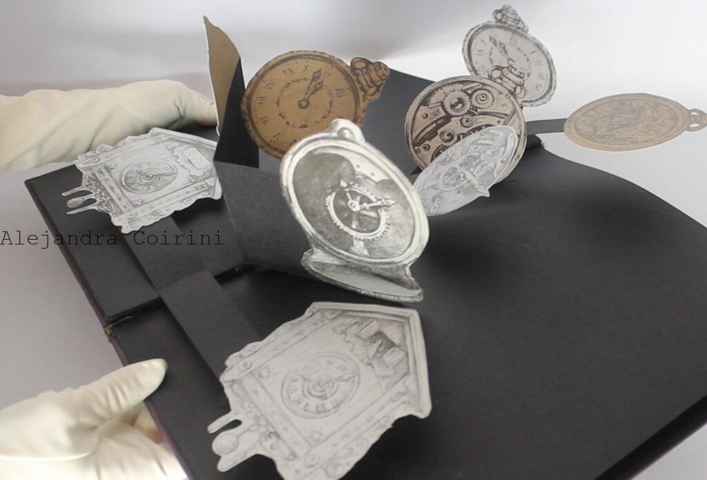 Ventana al Tiempo es un libro de artista que explora la memoria y la percepción del tiempo a través de la imagen de distintos tipos de relojes: cucús, relojes de mesa, despertadores y de bolsillo. Cada reloj se despliega en tres niveles visuales: interno, medio y externo, fragmentando la imagen en capas superpuestas que invitan a una lectura pausada y sensorial.